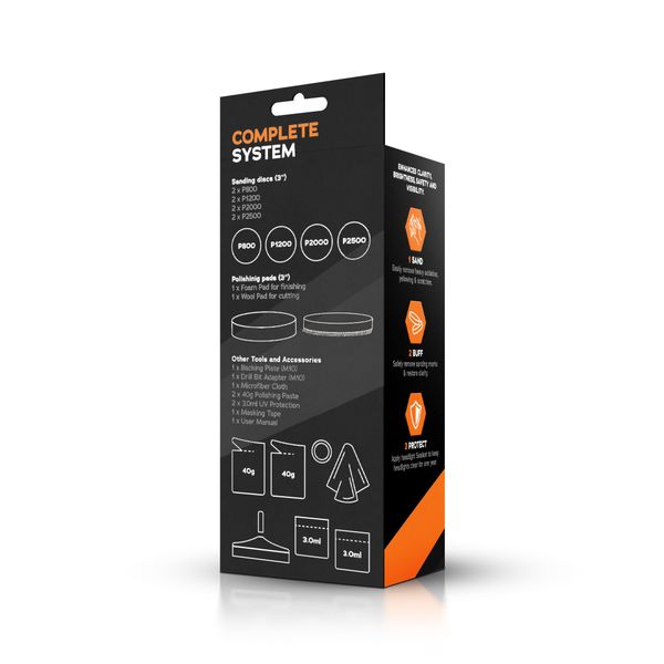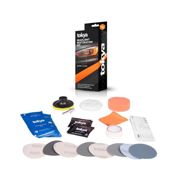 Tokya Headlight Restoration Kit on laadukas umpioiden kiillotussetti, joka sisältää kaiken mitä tarvitset sameutuneiden ja mattaantuneiden ajovalojen alkuperäisen loiston palauttamiseen. Tämä setti mahdollistaa umpioiden hionnan, kiillotuksen sekä suojauksen joko käsin tai koneellisesti vaikka omassa autotallissa, joten näkyvyyden, ajoturvallisuuden ja ajoneuvon ulkonäön kohentaminen ei voisi enää yksinkertaisempaa olla! Helppokäyttöiset tuotteet yhdistettynä selkeisiin ja yksityiskohtaisiin ohjeisiin takaavat, että naarmut ja hapettumat saadaan poistettua huonokuntoisimmistakin umpioista, ja niiden alkuperäinen kirkkaus ja kiilto saadaan palautettua kotikonstein.