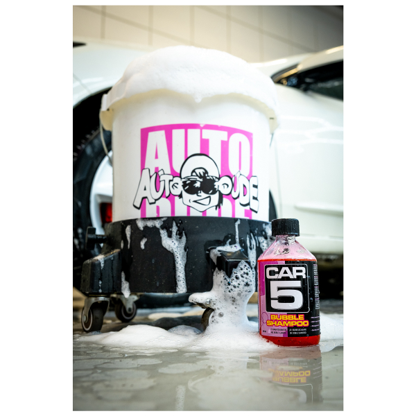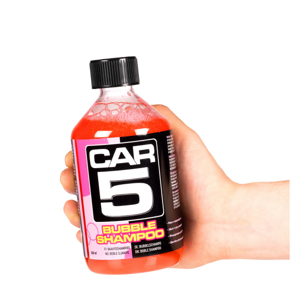 CAR5 Bubble Shampoo on tehokas, äärimmäisen voimakkaasti vaahtoava ja riittoisa pH-neutraali autoshamopoo, joka soveltuu niin ylläpitopesuihin kuin ennen suojausta tehtävään perusteelliseen pesuun. Se puhdistaa pestävät pinnat tehokkaasti, ja muodostaa äärimmäisen liukkaan kerroksen pesuvälineen ja pestävän pinnan välille. Tämä estää lian hieroutumista pintaa vasten, mikä sekä helpottaa pesua että estää tehokkaasti pesunaarmujen syntymistä. Voimakkaan vaahtoavuuden ansiosta shampoo ei myöskään kuivahda pintaan yhtä herkästi kuin monet muut shampooot, joten autoa kinnastellessa ei tarvitse kiirehtiä! Vaahtoavuus mahdollistaa myös sen, että shampoo voidaan levittää pintaan vaahdottimella. Bubble Shampoo on täysin vahaturvallinen, se ei siis kuluta alla olevaa vahakerrosta tai pinnoitetta. Shampoo ei myöskään jätä jälkeensä vahaa tai muita suoja-aineita, ainoastaan täydellisen puhtaan pinnan. Erinomaisen vaahtoavuuden ja todella liukkaan koostumuksen lisäksi herkullinen, makea purukumin tuoksu kruunaa pesuhetken.