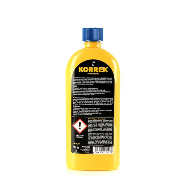 Korrek Autopesu -Autoshampoo on voimakkaasti vaahtoava pesuaine maali- ja metallipinnoille. Se poistaa helposti kuran, noen yms. lian. Jättää pinnalle kiiltävän vahakalvon vahvistaen vahauksen vaikutusta.