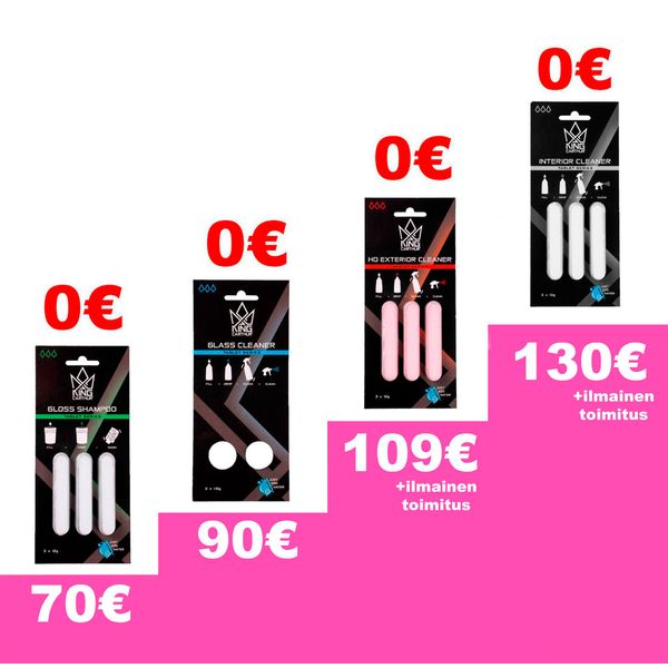 70€ ylittyessä Gloss shampoo tabletit lisäytyy automaattisesti. 90€ ylittyessä mukaan tulee shampootablettien lisäksi lasinpesuainetabletit. 109€ ylittävissä mukaan tulee aiempien lisäksi vahva esipesuaine ulkopinnoille tablettimuodossa ja ILMAINEN TOIMITUS koko tilaukselle, ja 130€ yli kun mennään, niin lisätään mukaan vielä sisätilojen puhdistusainetabletit!
