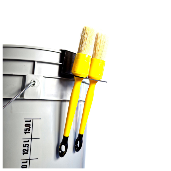 Pesuämpärin kylkeen kiinnitettävä pidike, jossa on paikat kahdelle harjalle tai brushille. Mukavoittaa pesua, pitäen suosikkiharjasi helposti käden ulottuvilla!