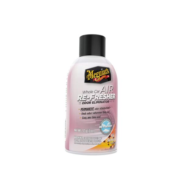 Meguiars Air Re-Fresher on koko autoon tarkoitettu hajunpoistaja, mikä sumutettavana tunkeutuu auton hankaliimpiin paikkoihin. Air Re-Fresher kulkee ilmastointijärjestelmän läpi jättäen autoon raikkaan tuoksun. Poistaa mm tupakan, eläinten ja muut yleiset hajut tehokkaasti. Kertakäyttöinen.