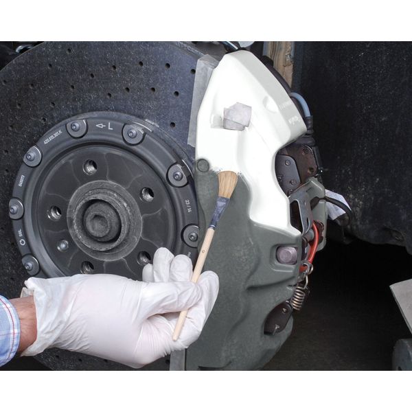 Irrota rengas autosta päästäksesi käsiksi jarrusatulaan. Puhdista kaikki irtolika sekä mahdollinen ruoste jarrusatulasta mukana toimitettavalla teräsharjalla. Tässä vaiheessa on suositeltavaa käyttää hengityssuojainta, jotta vältyt hengittämästä satulan pinnasta irtoavaa ruoste- ja jarrupölyä. Tämän jälkeen puhdista pinta vielä huolellisesti mukana tulevalla puhdistusaineella. Anna pinnan kuivua n. 5 min. Kun puhdistus on suoritettu, suojaa jarrulevy esimeriksi teipillä, jotta siihen ei vahingossakaan tule maalia.
