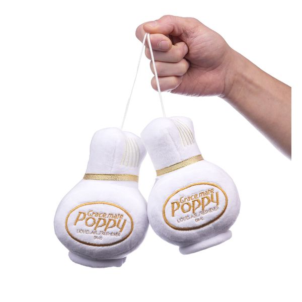 Grace Mata Poppy Pluche Bottle:t ovat ikonisten Poppy-ilmanraikastimien pohjalta muovatut karvanopat, jotka muistuttavat esikuvaansa - pehmeässä muodossa! Tyylikkäät ja yksityiskohtaiset Pluche Bottle -karvanopat on koristeltu kultaisella koristenauhalla sekä Grace Mate Poppy -kirjonnalla, ja muistuttavat aivan alkuperäisiä tuoksupulloja. Nämä tyylikkäät karvanopat voidaan ripustaa esimerkiksi taustapeiliin, mutta poikkeuksellisen pitkän nauhan (70cm) ansiosta ne voidaan ripustaa käytännössä mihin tahansa ja mille korkeudelle tahansa. Täydennä ajoneuvosi sisustan look sinisillä, valkoisilla, punaisilla tai ruskeilla Poppy-pullonopilla, ja erotu joukosta!