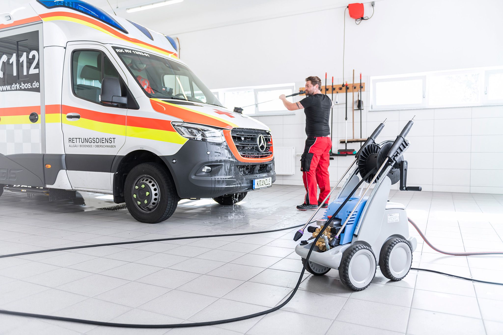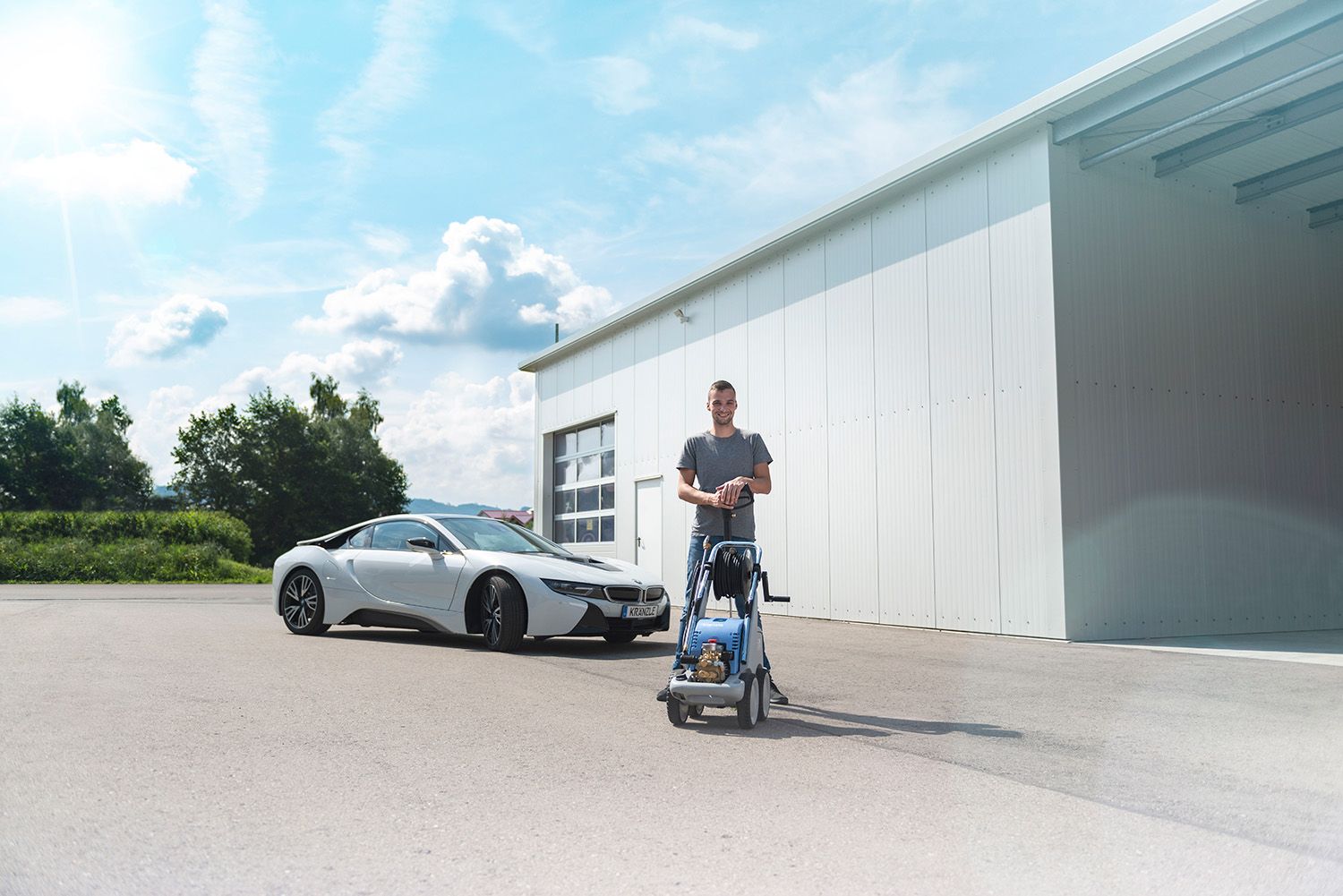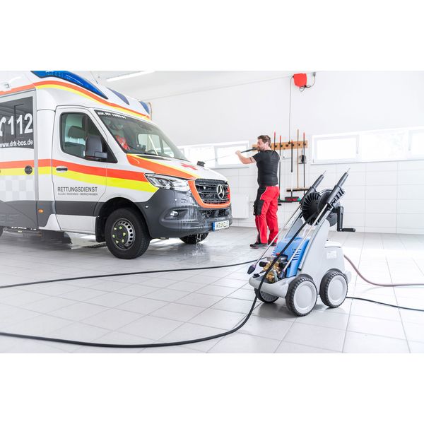 Pesurista löytyvä täyspysäytys-järjestelmä (TST) sammuttaa moottorin heti, kun käynnistyskahva vapautetaan. Kun käynnistyskahvaa painetaan uudelleen, moottori käynnistyy välittömästi. Moottori ja pumppu ovat käynnissä vain sen ajan, kun niitä todella tarvitaan, joten moottorin kuluminen ja melu vähenevät. Lisäksi pesurissa on kuivakäyntivarmistus, ohituskäyttö ja mahdollisuus paineensäätöön pestävän kohteen mukaan. Korroosiovapaa rakenne takaa helpon ja turvallisen säilytyksen ja neljän renkaan ansiosta pesuria on helppo liikutella tarpeen mukaan. Pesurista löytyy myös seisontajarru, jolla renkaat saadaan tarvittaessa lukittua, ja näin pesurin säilytys onnistuu myös hieman kaltevilla pinnoilla.