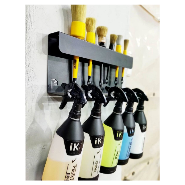 Poka Premium Brush and bottle holder on erittäin monipuolinen kiinnike mm. pesuharjoille ja siveltimille sekä myös suihkepulloille. Pidikkeeseen saadaan joko 7 tai 14 harjaa asetettua siististi seinälle ja kummassakin telineessä on kahta erikokoista reikää harjoille, joten siihen sopii käytännössä kaikki harjat ja siveltimet. Pidike voidaan kiinnittää seinään, jolloin harjat ja pullot eivät vie tilaa pöydiltä.