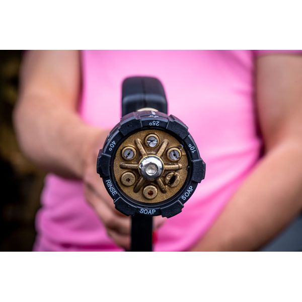 Dr Dirt Jet Nozzle G3 6-in-1 on päivitetty versio valmistajansa huippukätevästä, kuusi erilaista suihkukuviota sisältävästä painepesurin suuttimesta. Siinä missä normaalissa suuttimessa on yleensä ainoastaan yksi suihkukuvio, löytyy tästä erikoissuuttimesta niitä jopa kuusi: 3 eri levyistä viuhkasuutinta (10, 25 ja 40°), sekä kolme vapaasti virtaavaa suutinta, joilla onnistuu esim. herkkien pintojen huuhtelu tai pesuaineen levitys (mikäli painepesurista löytyy pesuaineen syöttö). Suutin kiinnittyy yhteensopivaan suihkuputkeen (esim. Dr Dirt Magic Wand G3) tai suoraan painepesurin kahvaan (esim. Dr Dirt Pressure Gun G3) kätevästi päivitetyllä SnapLock™-pikaliittimellä, jonka ansiosta se on helppo esimerkiksi irrottaa hetkellisesti vaikkapa vaahdottimen tieltä, ja kiinnittää taas paikoilleen huuhtelua varten. Monikäyttöisen suuttimen ansiosta kaikki pesutehtävät onnistuvat ilman tarvetta irrallisten suuttimien kanssa tuskailulle. Suihkukuvion vaihtaminen tapahtuu erittäin helposti: suutin kierretään halutun, selkeästi merkityn suihkukuvion kohdalle.