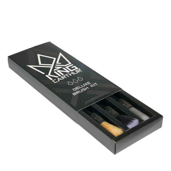 King Carthur Deluxe Brush Kit sisältää kolme laadukasta brushia, jotka kattavat kaikki ajoneuvon puhdistustyöt. Leveimmän harjan puuterihuiskumainen harjas on todella pehmeää, joten se ei naarmuta herkempiäkään pintoja. Sitä voidaan käyttää esimerkiksi auton mallimerkkien ja näyttöjen sekä mittaristojen reunojen putsaukseen. Kapeampi, vaalealla harjaksella varustettu suti soveltuu hyvin sitten muiden ulkoisten pintojen, kuten vaikkapa vanteiden putsaukseen. Keltaisella harjaksella varustettu kapeampi suti on luonnonharjasta, joten se soveltuu erinomaisesti auton sisätilojen puhdistukseen. Kapean muotoilunsa ansiosta sillä päästään puhdistamaan myös pienet ja syvät kolot, joihin ei mikrokuituliinalla päästä käsiksi. Luonnonharjas on hellävaraista, joten se soveltuu hyvin myös esimerkiksi ovien rakojen, tuuletusritilöiden sekä penkkien välien puhdistukseen.