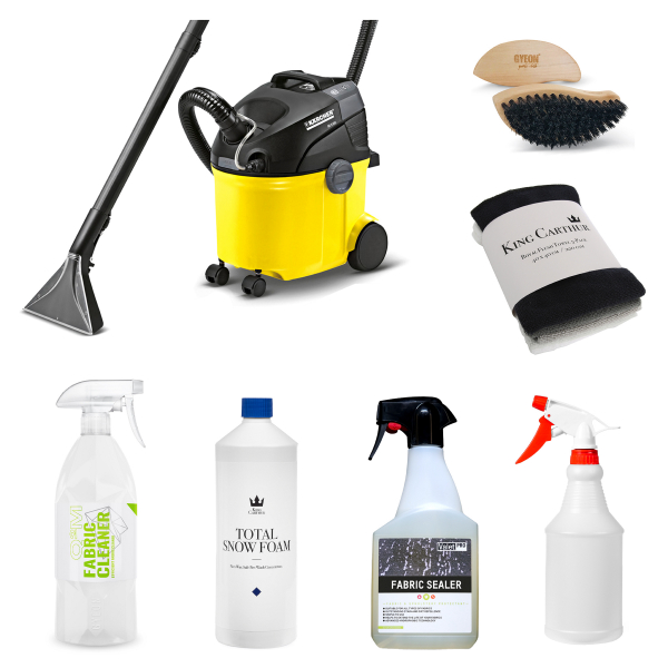 Huom! Voit ostaa joko pelkän tekstiilipesurin, tekstiilipesurin ja tekstiilien puhdistusaineen (ValetPRO Classic Carpet Cleaner, 5000 ml) TAI kaiken kattavan DELUXE-setin, mikä sisältää normaalin toimitussisällön lisäksi seuraavat tuotteet:
