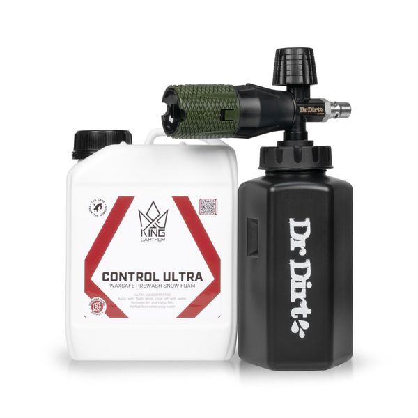 Dr Dirtin ammattitason Professional-vaahdottimesta sekä KC:n tehokkaasta ja riittoisasta Control Ultra -esipesuaineesta koostuva vaahdotussetti, jonka avulla auto voidaan esipestä parhaillaan jopa 50 kertaa! Setti näyttää pieneltä, mutta tarjoaa esipesuun kaiken tarvittavan jopa vuosiksi. King Carthurin Control Ultra on valmistajan supersuositun Control Snow Foamin pohjalta jatkojalostettu esipesuaine, joka on edeltäjäänsä neljä kertaa tehokkaampi, eli sitä tarvitaan vain neljäsosa jopa paremman pesutehon saavuttamiseen kuin alkuperäistä Controlia. Yksi 2.5 litran kanisteri vastaa 10 litraa aiempaa versiota, joten yhdellä pienellä kanisterilla pääset TODELLA PITKÄLLE! Tehokas pesuaine yhdistettynä 12-portaisella seossuhteen säädöllä, 90° kääntyvällä suuttimella sekä kätevällä SnapLock™-pikaliittimellä varustettuun vaahdottimeen antaa jokaiselle avaimet onnistuneeseen esipesuun!