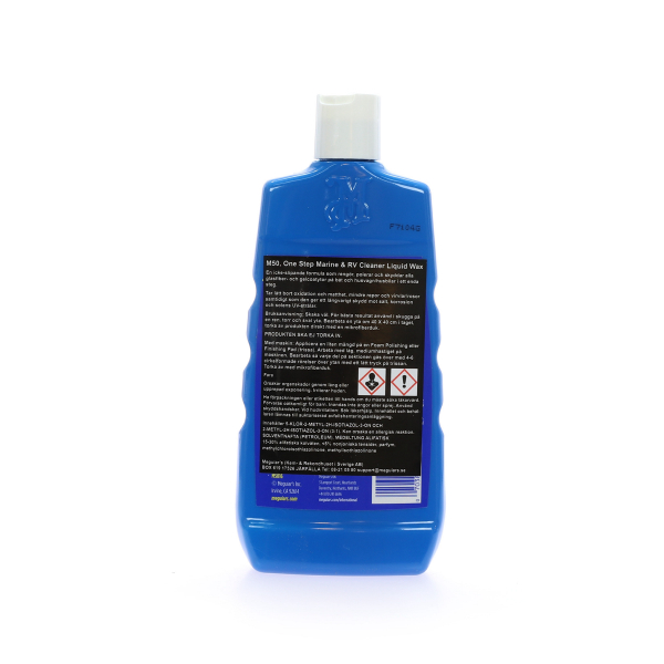 Meguiars Marine Cleaner Wax One Step poistaa turvallisesti maltillisia hapettumia, tahroja sekä naarmuja lasikuidulta sekä GelCoat -pinnoilta. Puhdistaa kemiallisesti, ei sisällä hiontarakeita. Kiillottaa, hoitaa sekä antaa erittäin pitkäkestoisen suojan yhdellä työvaiheella. Sisältää myös antikorroosioaineita, suojaa hyvin myös suolavedeltä sekä UV-valolta. Sopii veneille sekä matkailuajoneuvoille.